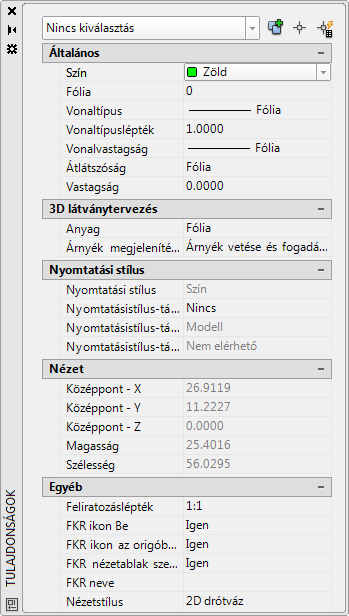 Ha nincs objektum kijelölve, akkor a fent kiemelt legördülő listák a rajz aktuális beállításait jelenítik meg. Ha kijelöl egy objektumot, akkor a legördülő listák annak az objektumnak a tulajdonságbeállításait fogják megjeleníteni.