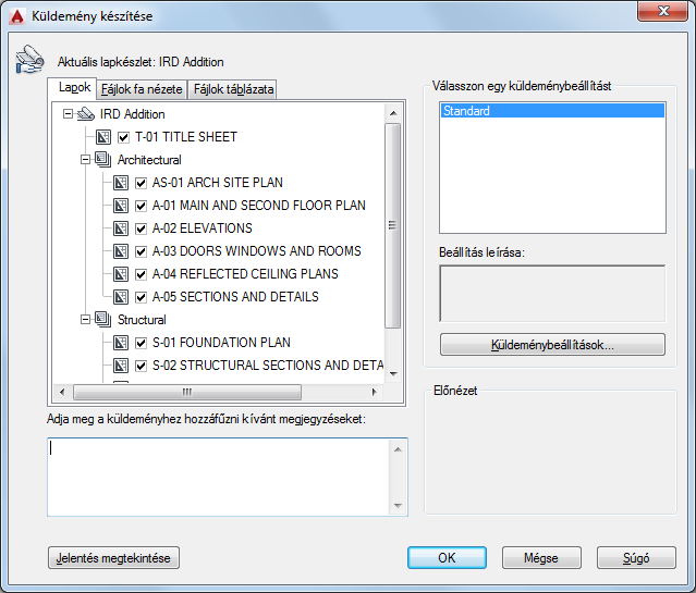 Jelentésinformációt jelenít meg, amely belekerül a küldeménycsomagba. Magában foglal minden beírt küldemény-megjegyzést, és tartalmazza azokat a program által automatikusan létrehozott disztribúciós megjegyzéseket, amelyek részletezik, hogy milyen lépések szükségesek a küldeménycsomag tökéletes működéséhez. Ha például SHX betűtípusok találhatók egy küldött rajzban, megjelenik egy útmutató arról, hova kell másolnia ezeket a fájlokat ahhoz, hogy azok a küldeményt telepítő számítógépen észlelhetők legyenek. Ha készült alapértelmezett megjegyzéseket tartalmazó szövegfájl, akkor a jelentés ezeket is tartalmazza.