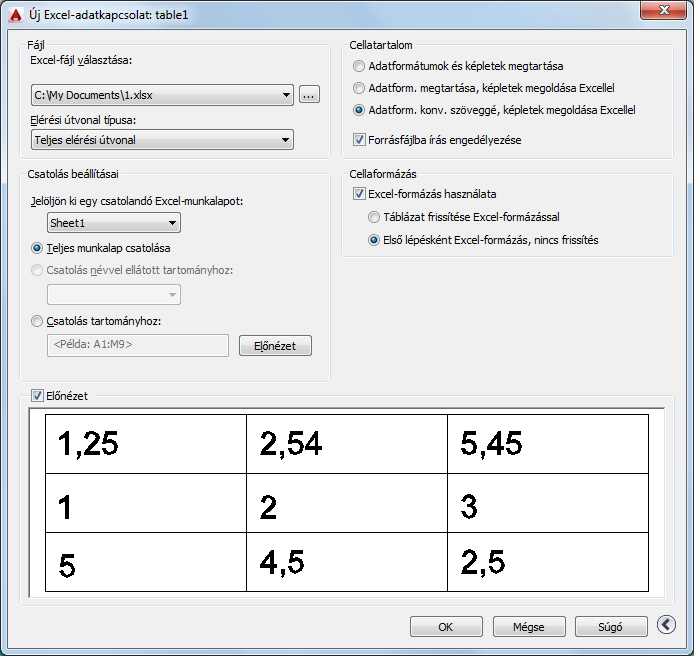 A rajzba importál az eredeti XLS-, XLSX- vagy CSV-fájlban megadott mindenféle formázást, de az ADATKAPCSOLATFRISSÍT parancs hatására a módosított formátumok nem frissülnek.