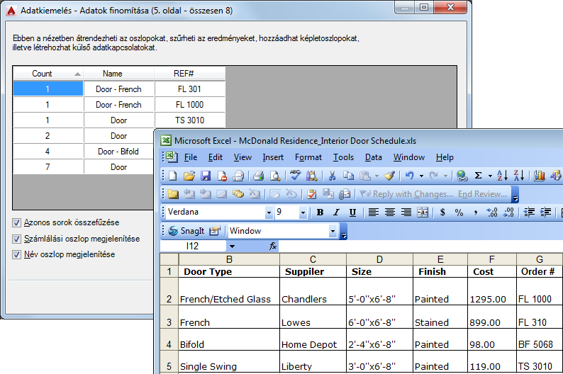 Az Excel számolótáblákban tárolt adatok összekapcsolhatók és egyesíthetők a kiemelt rajzadatokkal (objektumtulajdonság-adatokkal). A fenti példát folytatva tegyük fel, hogy a rajzban szereplő ajtókhoz további adatok (szállító és költség) állnak rendelkezésre egy Excel számolótáblában. Kiválasztja a számolótábla Szállító és Költség oszlopát, és egyesíti az adatkiemelés egyéb adataival.