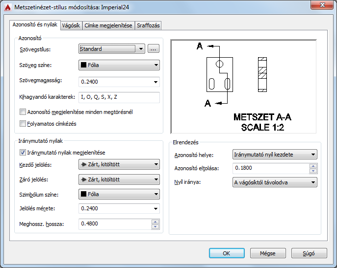 Beállítja a metszetvonalak által használt azonosítók és iránymutató nyilak tulajdonságait.