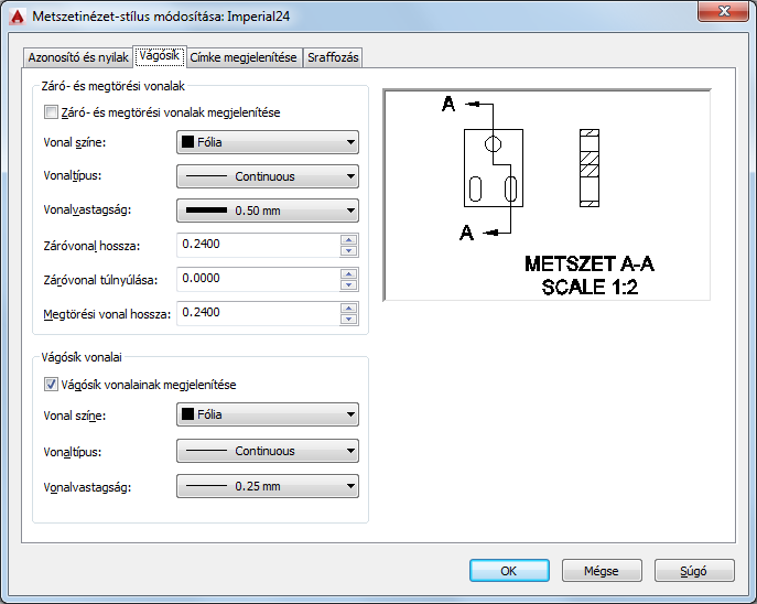 Beállítja a metszetvonalak által használt záró- és hajlítási vonalak, valamint a síkvonalszakaszok tulajdonságait.