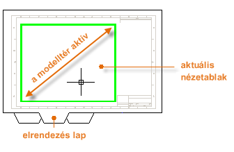 Az elrendezési nézetablakok olyan objektumok, amelyek a papírtérben jönnek létre a modelltér léptékezett nézetének megjelenítéséhez. Ez egy zártláncú televízióhoz hasonlít, amely a modelltér egy részét jeleníti meg. Az ábrán a modelltér aktív és elérhető az aktuális elrendezési nézetablakról.