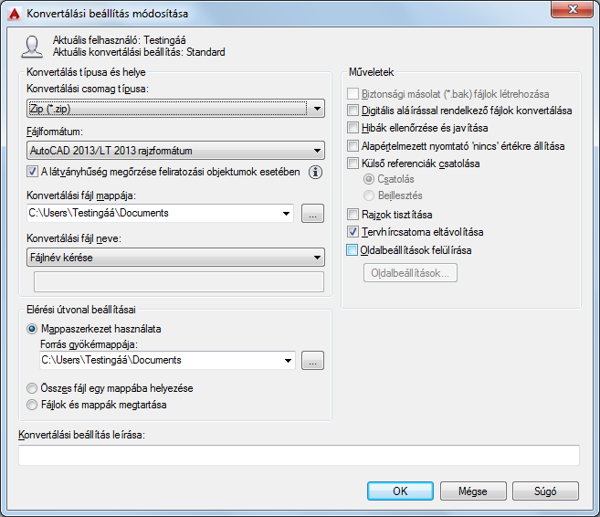 Adja meg a konvertálási beállítás leírását. Ez a leírás a DWG-konvertálás párbeszédpanelen, illetve a Konvertálási beállítások párbeszédpanelen jelenik meg, a konvertálásifájl-beállítások listája alatt. A listában szereplő bármelyik konvertálási beállításkészletet kijelölheti, és megtekintheti a hozzá tartozó leírást.