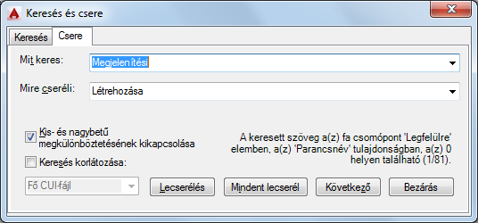 Egy üzenet jelenik meg, amely leírja a karakterlánc találati helyét, és a keresés által visszaadott találatok számát.