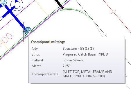 Az eszköztipp megjeleníti a víznyelő medencéhez rendelt költségvetési tételek leírását és azonosítóját.