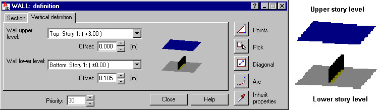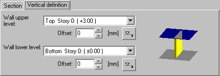 When defining the vertical location of a wall, you can define an offset from the lower or upper level of a story. If the offset equals 0, the definition line coincides with the upper or lower plane. Click