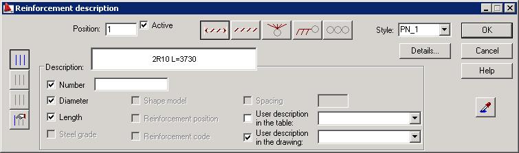 Note: Two additional options are available in the dialog as shown below: Description style (used to modify a description style of the reinforcement chosen) and the Details button, which when clicked, opens the dialog used for modifying a