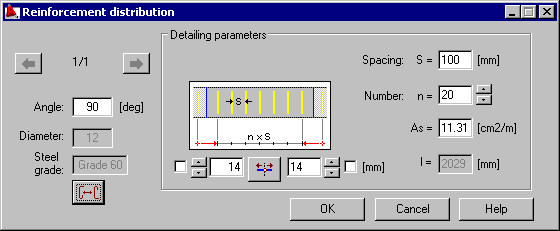 The parameters listed above are illustrated by a schematic drawing provided in the dialog. The options located next to the drawing enable you to position precisely the distribution of reinforcement in a given zone:
