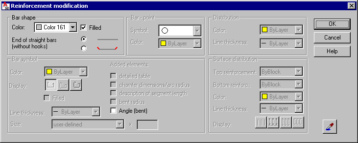 After selecting the Modify: graphical parameters of reinforcement option, select bar reinforcement. The following dialog displays: