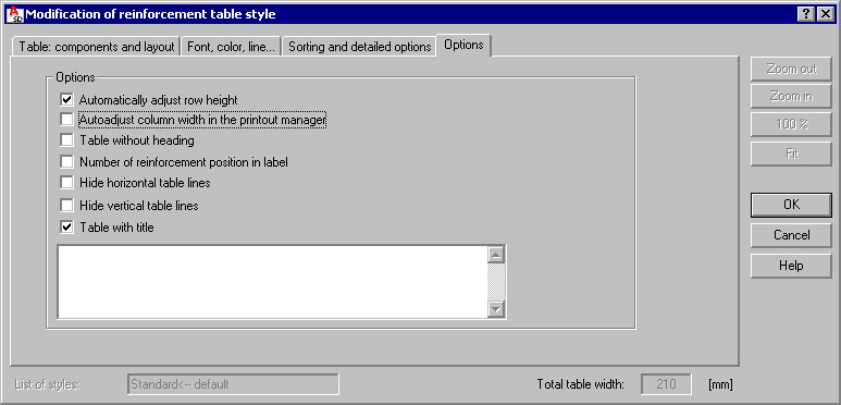 Once the Options tab is selected in the Definition/modification of reinforcement table style dialog, the following dialog displays: