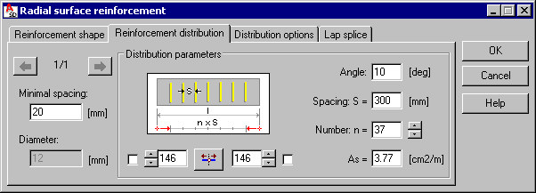 Use this option to define parameters of a reinforcement distribution. It is accessible by selecting the Reinforcement distribution tab, the Reinforcement: definition and detailing - radial reinforcement dialog displays: