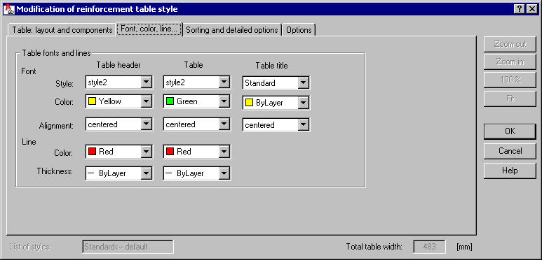Once the Font, color, line tab is selected in the Definition/modification of reinforcement table style dialog, the following displays: