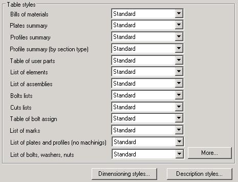 Use these parameters to define table styles for the table types available in the software (Bills of materials, Profile summary, Plate summary, and so on). The selection lists include all the styles defined in a project.