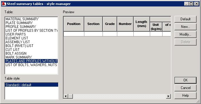 - Modify - click this to open the Modification of steel summary table style dialog, where you can make changes in a selected table type and table style.