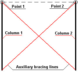 The axis of a strut profile is determined by the positions of points 1 and 2 in the main bracing plane.Point 1 is the point of intersection of the axis of column 1 and the second auxiliary line of a bracing; point 2 is the point of intersection of the axis of column 2 and the first auxiliary line (see the drawing below).