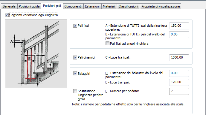 | Specificare le proprietà dei pali quali pali fissi, pali dinamici e balaustri quando si aggiungono o si modificano le ringhiere | Selezionare Consenti variazione ringhiera. |