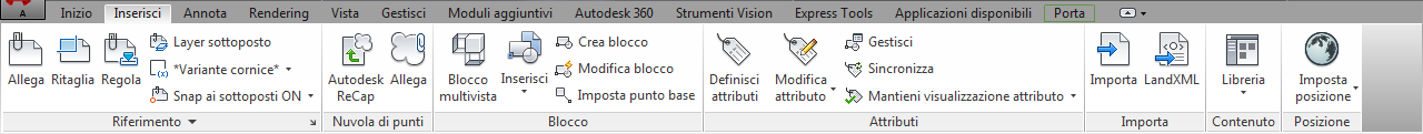 - Blocco. Contiene comandi per inserire e modificare blocchi e blocchi multivista.