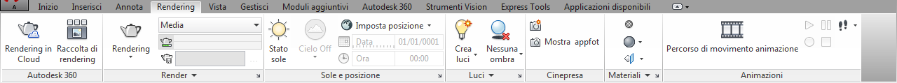 Nella scheda Rendering sono disponibili tutti i comandi necessari per eseguire operazioni di rendering e utilizzare materiali, luci, cineprese e animazioni.