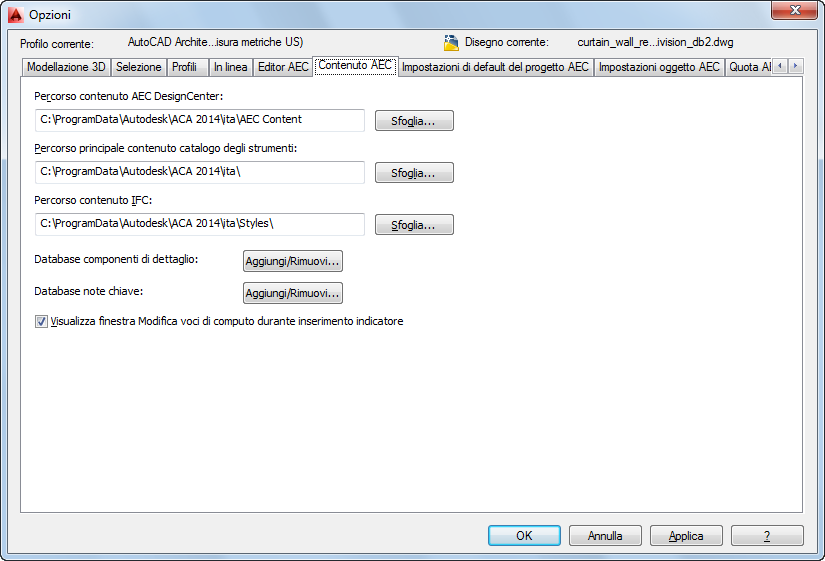 - È consigliabile non salvare i file di contenuto AEC personalizzati nelle cartelle Imperial e Metric, ma salvarli in una cartella a parte. È possibile visualizzare il percorso per il contenuto AEC personalizzato nella scheda Contenuto AEC della finestra di dialogo Opzioni. Nel percorso indicato in Percorso contenuto AEC DesignCenter è possibile creare un numero illimitato di sottocartelle. Sarà possibile accedere a tali sottocartelle nella scheda Contenuto AEC del Design Center di AutoCAD. Il contenuto di tali sottocartelle avrà le stesse caratteristiche di qualsiasi altro tipo di contenuto AEC.