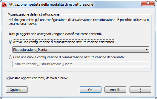 Quando si attiva la modalità di ristrutturazione in un disegno aperto in precedenza, è possibile continuare ad utilizzare la configurazione di visualizzazione di ristrutturazione esistente o crearne una nuova.