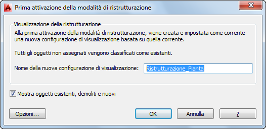 Viene visualizzata la finestra di dialogo Prima attivazione della modalità di ristrutturazione e alla nuova configurazione di visualizzazione viene assegnato per default un nome con il prefisso Ristrutturazione.