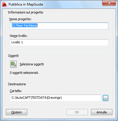 Se il disegno contenente gli oggetti da pubblicare fa parte di un progetto di costruzione, il nome del progetto e l'assegnazione del livello del disegno vengono visualizzati nella finestra di dialogo Pubblica in MapGuide.