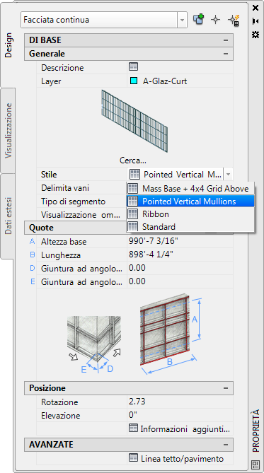Per selezionare uno stile diverso per la facciata continua nel riquadro proprietà, attenersi alla procedura indicata di seguito.