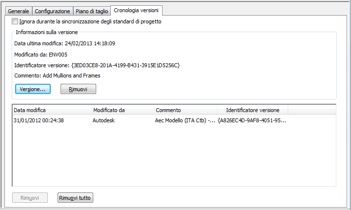 Ciascuna impostazione di visualizzazione di un disegno con standard di progetto presenta una cronologia delle versioni nella quale vengono visualizzati gli identificatori univoci di versione, la data e l'ora della modifica, il nome utente e qualsiasi commento aggiuntivo inserito dall'utente.