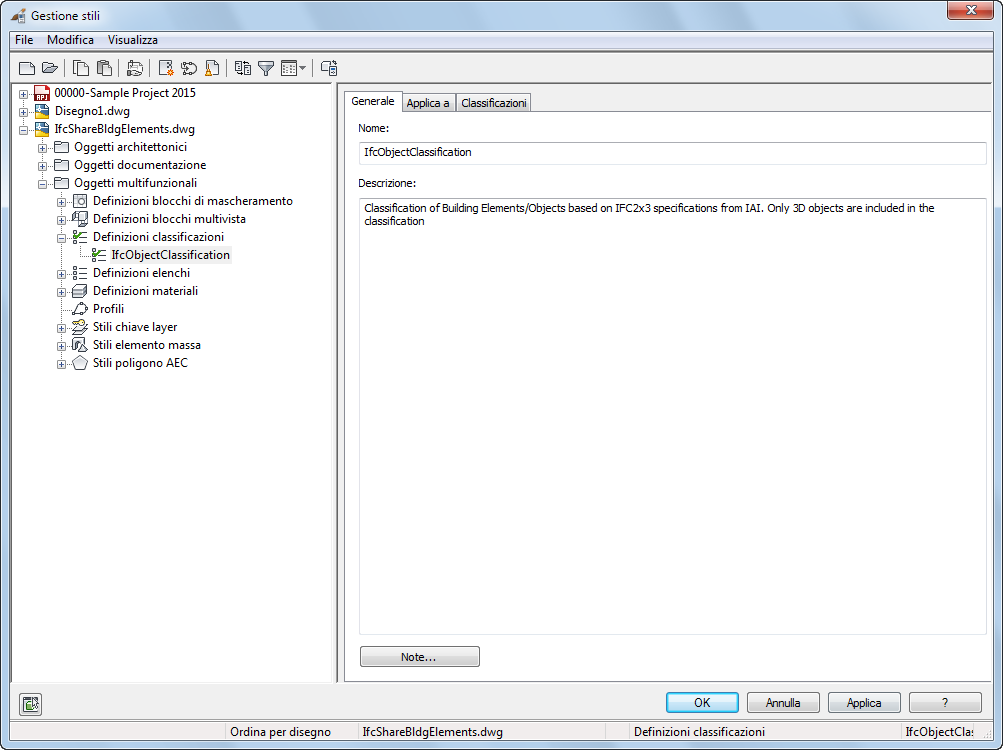 Esportando questo disegno nel formato file IFC vengono esportate anche le definizioni di classificazione. La definizione di classificazione è associata al tipo di oggetto al momento dell'importazione del disegno.