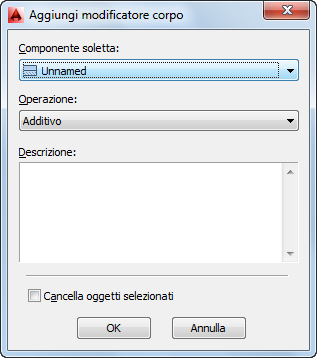 • Nell'elenco Operazione, selezionare Additivo se si desidera aggiungere il modificatore di corpo al componente selezionato, Sottrattivo se si desidera sottrarre il modificatore di corpo dal componente selezionato e Sostituisci se si desidera sostituire l'intero componente.