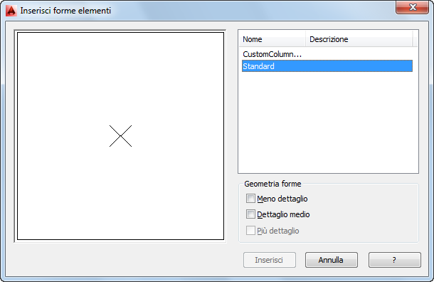 Per inserire in un disegno una o più geometrie definite per una forma personalizzata, attenersi alla procedura indicata di seguito. La geometria potrà quindi essere modificata oppure utilizzata così com'è per definire una delle rappresentazioni di visualizzazione durante la creazione o la modifica di un'altra forma di elemento personalizzata.