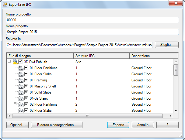 Per definire quali riferimenti esterni del file di progetto verranno esportati e la relativa modalità di visualizzazione nel file IFC, è sufficiente accettare le assegnazioni di livello di default o specificare un'etichetta diversa. Tutti i disegni che vengono assegnati alla stessa struttura IFC vengono esportati in IfcBuildingStorey all'interno del file IFC.