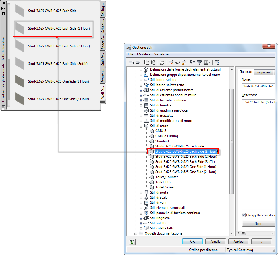 . Ad esempio, se si desidera creare uno strumento Muro con lo stile Stud-3.625 GWB-0.625 Each Side (1 Hour), espandere Stili di muro, quindi selezionare lo stile Stud-3.625 GWB-0.625 Each Side (1 Hour).