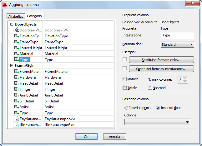 Ciascuna colonna contiene i valori di una singola proprietà in un gruppo voci di computo. Prima di poter creare colonne per le proprietà da specificare, è necessario che nel disegno esistano le definizioni di insiemi di proprietà delle stesse.
