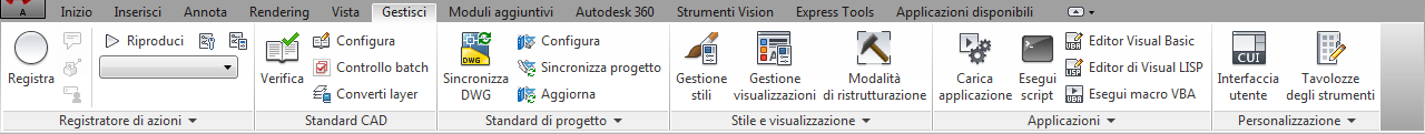 - Applicazioni. Contiene comandi per caricare applicazioni aggiuntive quali le applicazioni ARX, LSP o VB e per eseguire script definiti dall'utente e macro VBA. Consente inoltre di accedere a Gestione VBA e agli Editor di Visual Basic e Visual Lisp.
