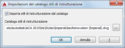Per default, il catalogo stili di ristrutturazione (AecRenovation.dwg) viene installato in ProgramData\Autodesk\ACA <versione>\ita\Styles. Se il catalogo stili di ristrutturazione viene rinominato o spostato, gli stili vengono disattivati e non è possibile accedervi. Utilizzare la finestra di dialogo Impostazioni del catalogo stili di ristrutturazione per specificare un catalogo valido.