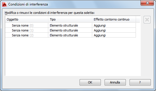 Nota: È inoltre possibile utilizzare il foglio di lavoro per rimuovere le condizioni di interferenza: fare clic con il pulsante destro del mouse sul valore per Oggetto o Tipo, quindi fare clic su Rimuovi. In alternativa, è possibile utilizzare la scheda contestuale della soletta o soletta del tetto. Quando si rimuove una condizione di interferenza, viene rimossa l'associazione tra la relativa soletta o soletta del tetto e l'oggetto utilizzato per creare la condizione, tuttavia l'oggetto non viene rimosso dal disegno.