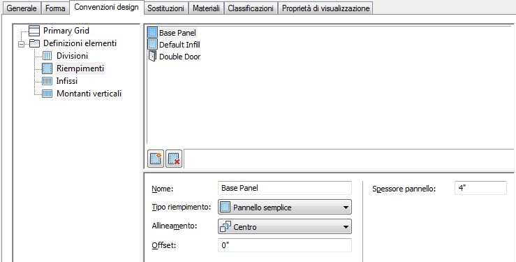 Le modifiche apportate, incluse quelle relative al nome della definizione, sovrascriveranno la definizione esistente. Per creare una nuova definizione dall'elenco delle assegnazioni, selezionare Nuovo dall'elenco degli elementi. Per creare una nuova definizione dall'elenco delle definizioni, fare clic sull'icona Nuova divisione, Nuovo riempimento, Nuovo infisso o Nuovo montante verticale.