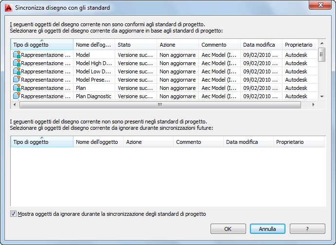 In questo caso, l'elemento non verrà più visualizzato nei successivi aggiornamenti, a meno che non si selezioni l'opzione Mostra oggetti da ignorare durante la sincronizzazione degli standard di progetto o non si rimuova il flag Ignora dall'impostazione di visualizzazione in Gestione visualizzazioni.