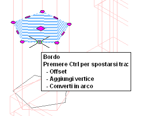 Avrà così inizio una sessione di modifica dinamica; questa condizione è indicata dai grip di colore magenta e dal tratteggio azzurro del profilo di modifica dinamica temporanea, come pure dal colore sbiadito di tutti gli altri oggetti nel disegno. Durante la sessione di modifica dinamica, si ha un accesso di modifica limitato ad altri comandi nel disegno. Prima di lavorare su altri oggetti, è necessario prima terminare la sessione di modifica dinamica.