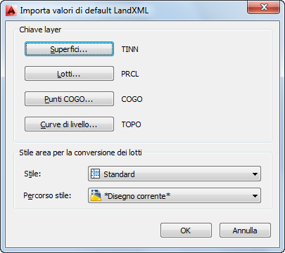 4. Nella finestra di dialogo Importa valori di default LandXML, selezionare un valore di default della chiave layer per gli oggetti importati.