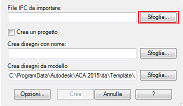- Nella finestra di dialogo Importa file IFC e crea disegni, in File IFC da importare, fare clic su Sfoglia.