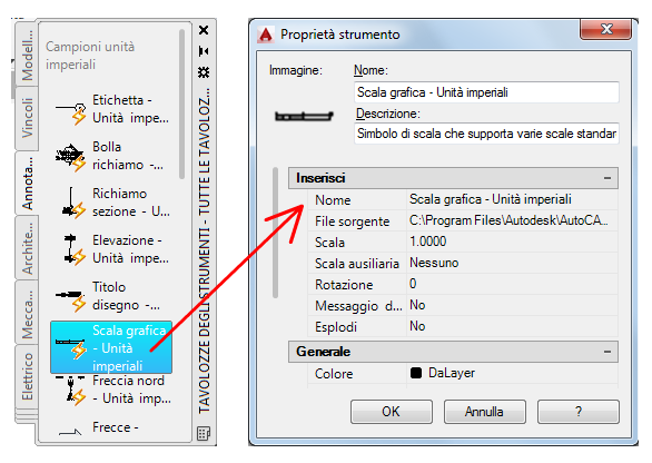 Dopo aver aggiunto uno strumento ad una tavolozza degli strumenti, è possibile modificarne le proprietà. È possibile ad esempio modificare la scala di inserimento di un blocco o l'angolo di un modello di tratteggio.