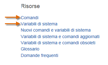 Premere F1 per aprire la Guida in linea. Nella pagina iniziale della Guida in linea, fare clic su Comandi o Variabili di sistema.