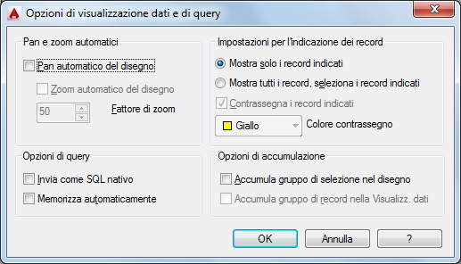Controllano la visualizzazione degli oggetti collegati nel disegno corrente quando si selezionano i record corrispondenti nella finestra Visualizzazione dati.