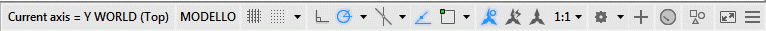 L'icona UCS con le linee d'asse di RTUCS e la riga di stato con le informazioni sull'asse corrente: