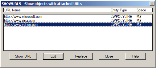 Immettere SHOWURLS per visualizzare la finestra di dialogo Showurls. È possibile fare clic su un singolo URL per visualizzarlo oppure fare clic su uno o più URL per modificarli o sostituirli.