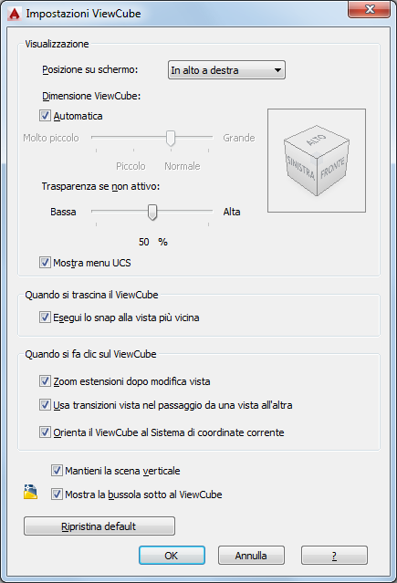 - Visualizzare la finestra di dialogo Impostazioni ViewCube.