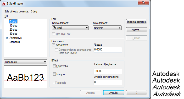 Nell'illustrazione che segue viene mostrato lo stesso font utilizzato da diversi stili con impostazioni di inclinazione diverse per il testo.